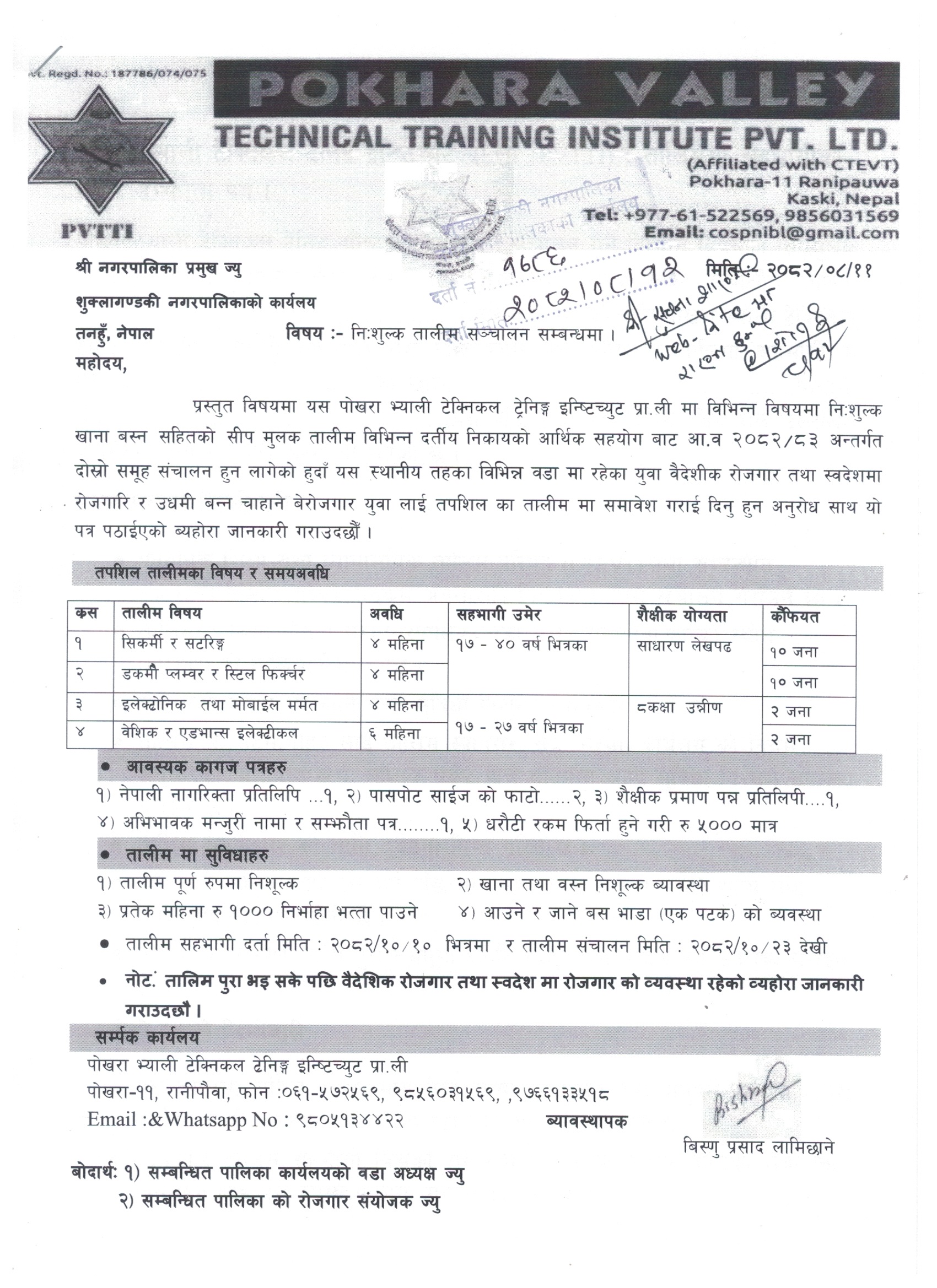 निशुल्क तालिम सम्बन्धि सूचना ।