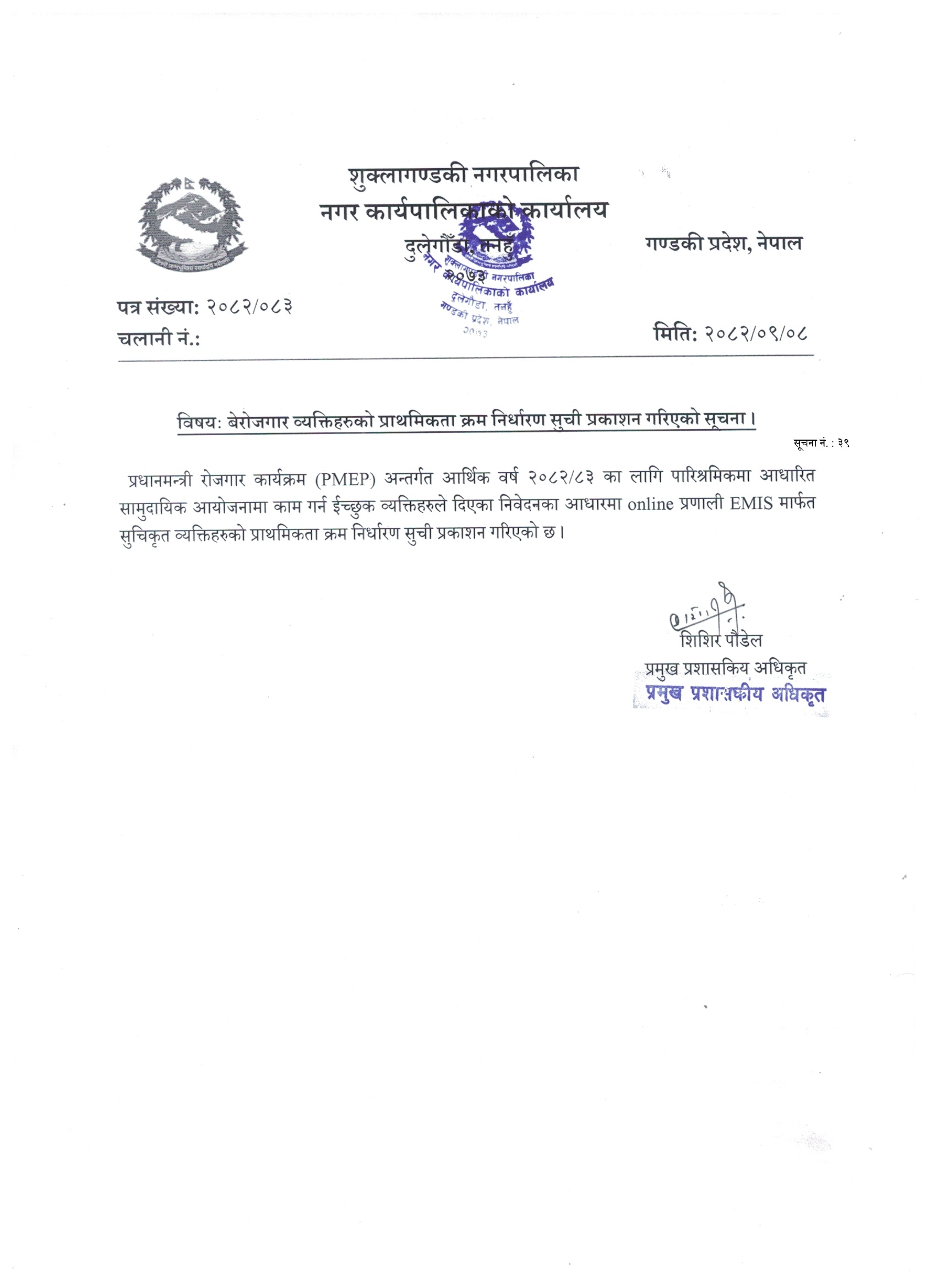 बेरोजगार व्यक्तिहरुको प्राथमिकता क्रम निर्धारण सुची प्रकाशन गरिएको सूचना ।