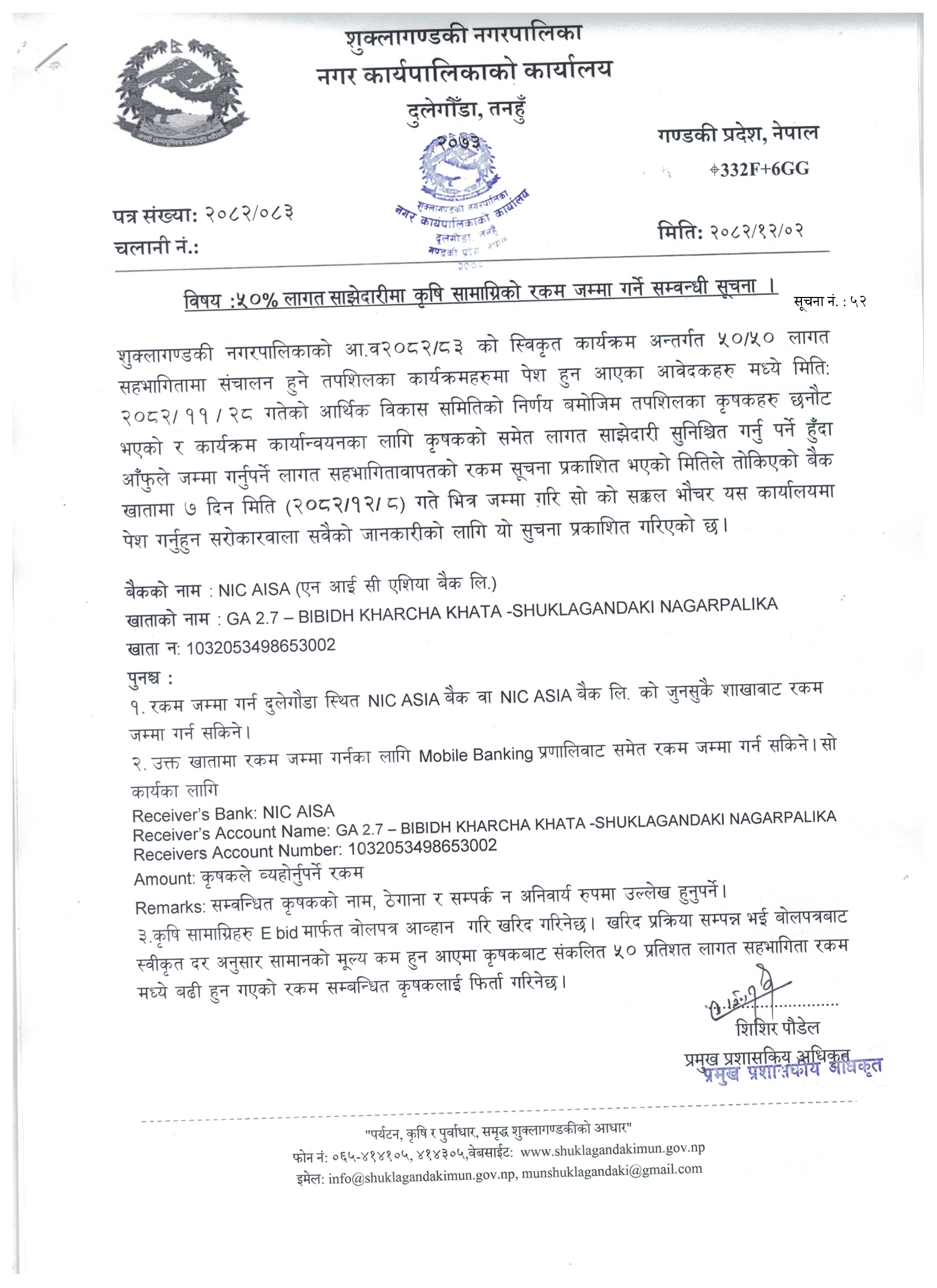 ५० % लागत साझेदारीमा कृषि सामाग्रीको रकम जम्मा गर्ने सम्बन्धी सूचना ।