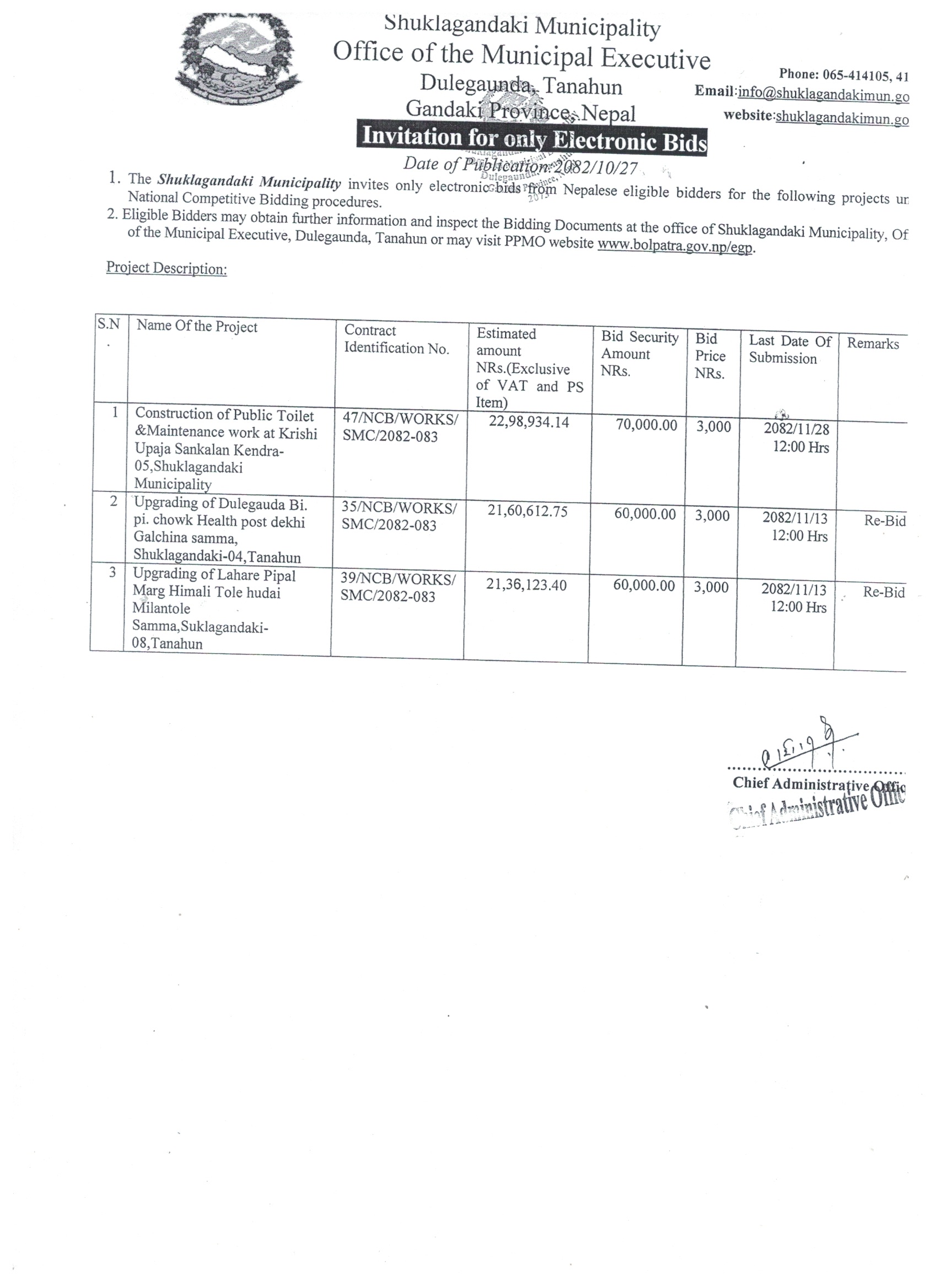 शुक्लागण्डकी नगरपालिका, नगर कार्यपालिकाको कार्यालय भवनको दोस्रो तल्ला निर्माणका लागी टेन्डर आव्हान सम्बन्धि सूचना