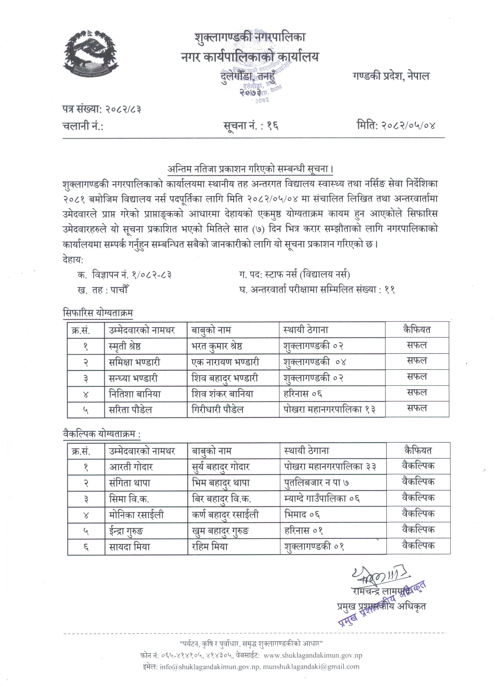 अन्तिम नतिजा प्रकाशन गरिएको सम्बन्धी सूचना । (विद्यालय नर्स)