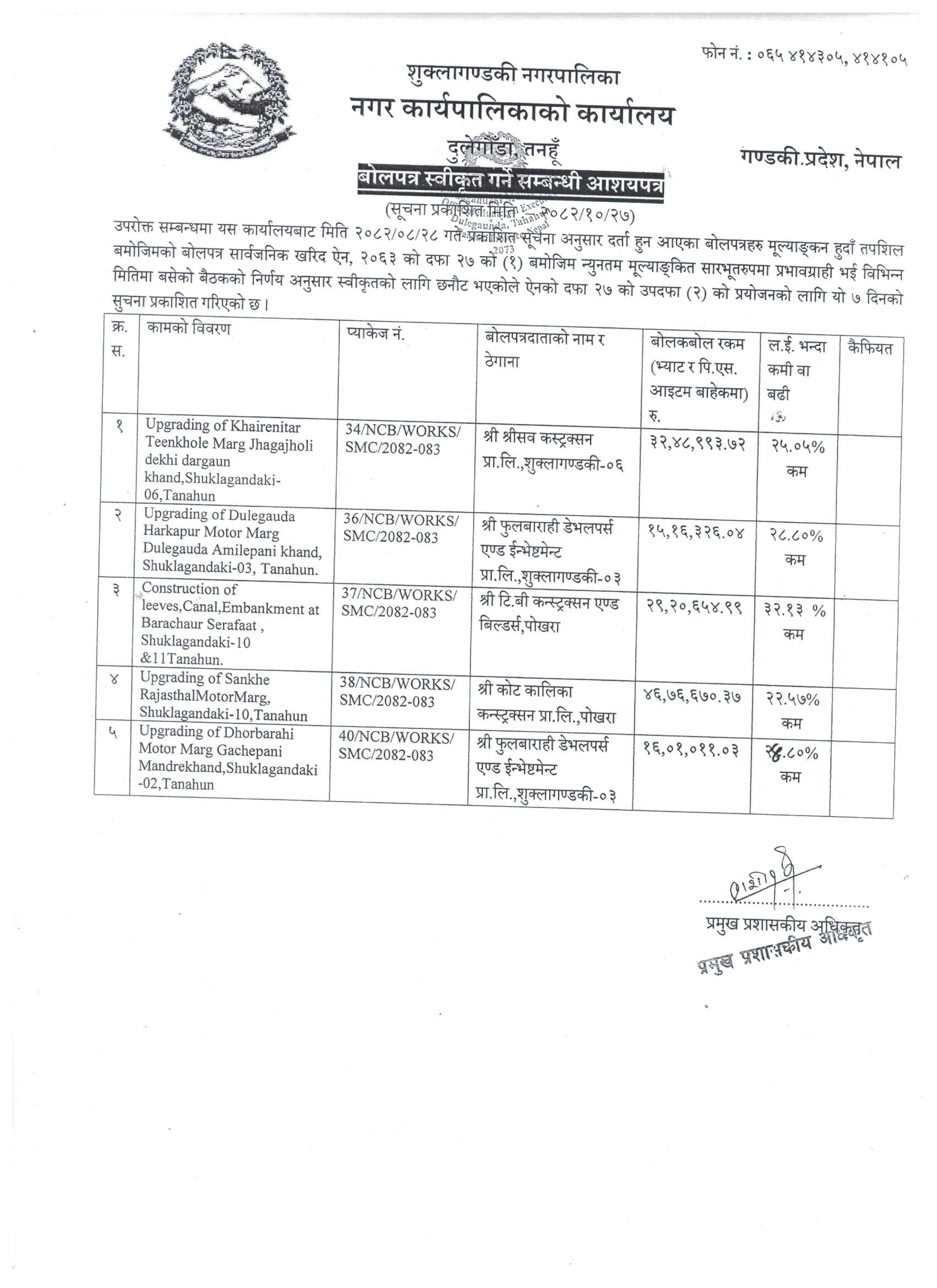 बोलपत्र स्वीकृत गरिएको आसय पत्र सम्बन्धि सूचना