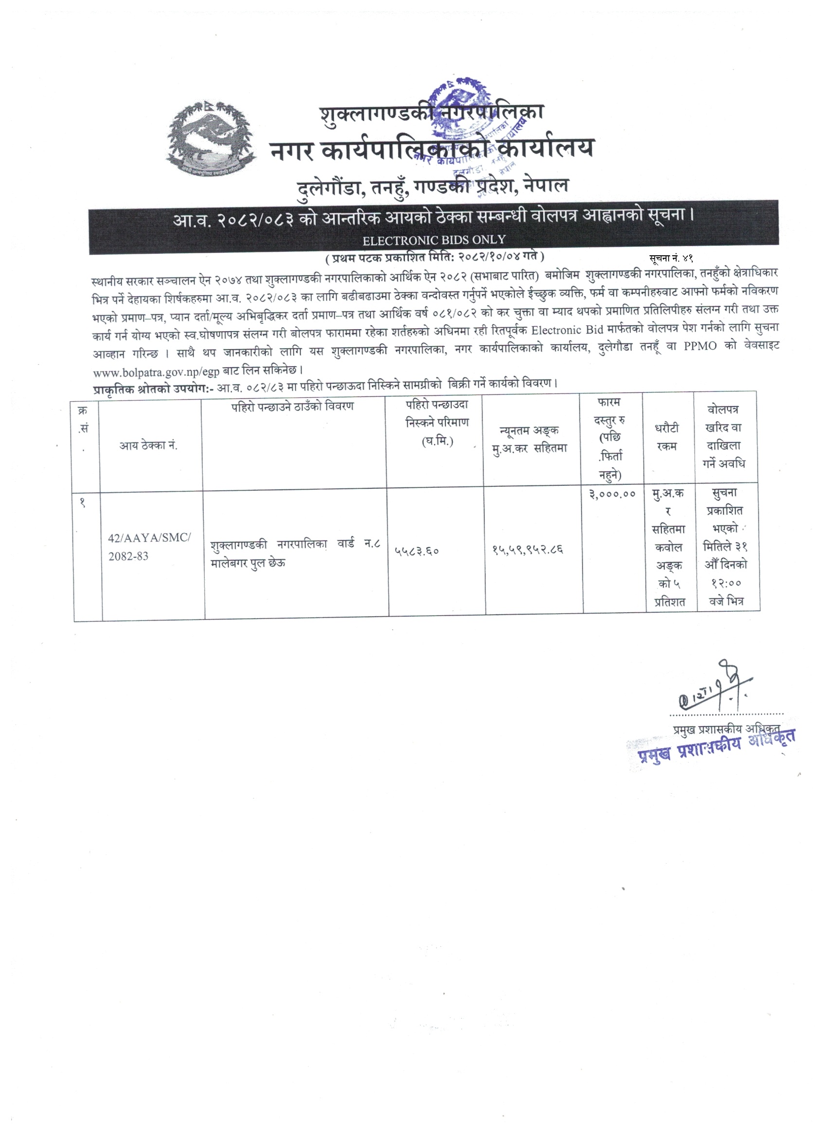 शुक्लागण्डकी नगरपालिका, नगर कार्यपालिकाको कार्यालय भवनको दोस्रो तल्ला निर्माणका लागी टेन्डर आव्हान सम्बन्धि सूचना